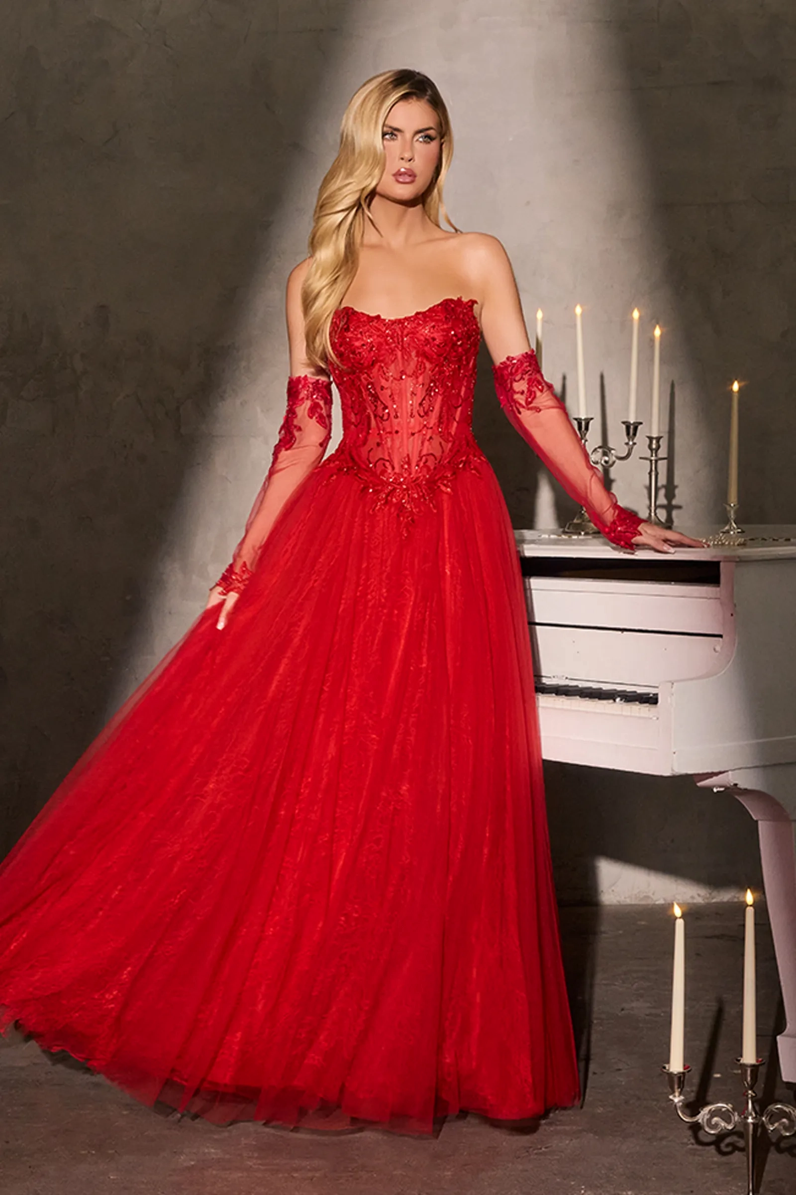 Crafted for dramatic elegance, this A-line gown features a strapless corset bodice adorned with intricate lace appliqué and shimmering hand beading. The sheer overlay and floor-length tulle skirt create ethereal dimension, while matching embellished gloves add a couture-worthy finish. Perfect for galas, black tie affairs, or any formal evening where sophistication is key. Key Features: Silhouette: A-line Design: Strapless illusion corset bodice with beading & matching embellished gloves Fabric & Material: Embroidered lace, beaded detailing & layered sheer tulle Fit Detail: Structured bodice with full flowing skirt & lace up corset bodice Occasions: Ideal for black tie galas, couture evening events, or formal celebrations