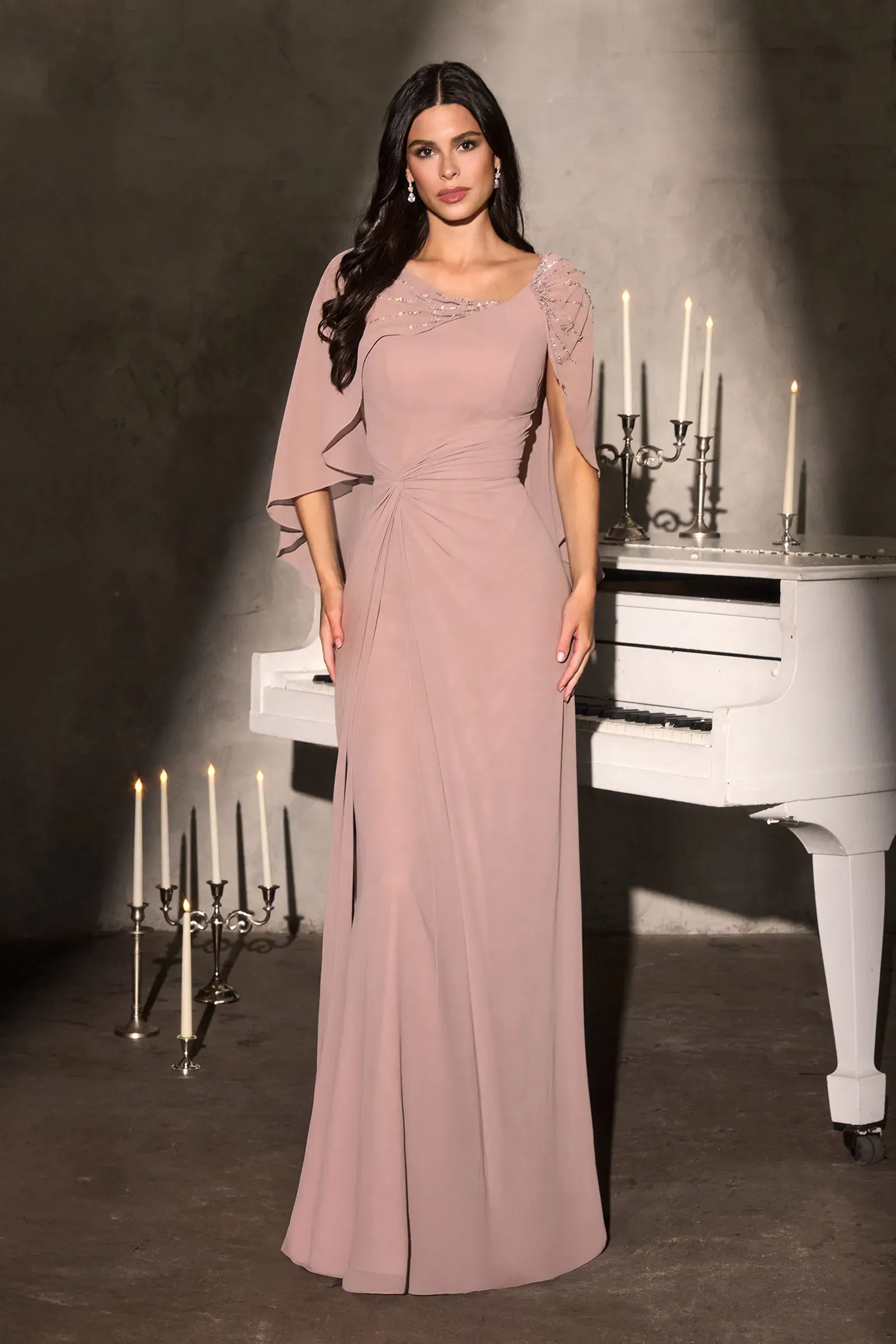 Designed for timeless elegance, this gown beautifully blends refined coverage with subtle sparkle. The soft, draped cape sleeves offer graceful movement, while delicate beading along the neckline creates a touch of luminous detail without overwhelming the silhouette. The gathered waist creates a flattering shape, giving comfort and confidence throughout the celebration. With a softly cascading skirt and modest neckline, this gown embodies sophistication—perfect for formal weddings, milestone celebrations, or evening events where elegance matters. Key Features: Silhouette: Classic column with soft draped overlay Design: Modest scoop neckline with embellished cape sleeves Fabric & Material: Lightweight chiffon with delicate beadwork detailing Fit Detail: Flattering gathered waist, soft-flowing skirt & back keyhole closure Occasions: Ideal for mother of the bride, formal weddings, galas & evening celebrations